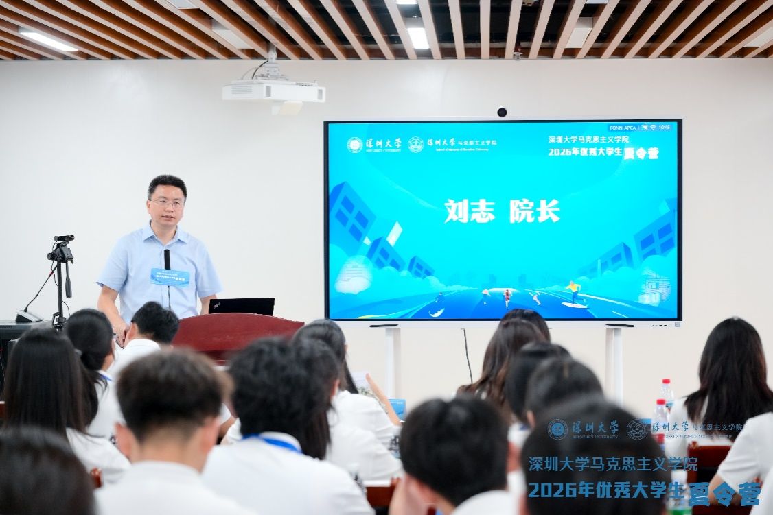随后,营员们前往汇文楼2623进行师生学术互动分享,刘志院长致辞。刘志院长围绕“选择深圳大学马院的价值与意义”深入分享,并以“天时、地利、人和”概括学院核心优势。他指出,深圳大学马院具有巨大的发展成长空间,从时代机遇的契合,到城市与学校资源的支撑,再到学院师资与学术平台的保障,学院为学生们提供扎实的成长土壤和铺就多元的成长路径,希望大家选择深圳大学马院,与改革同行、与时代共进。